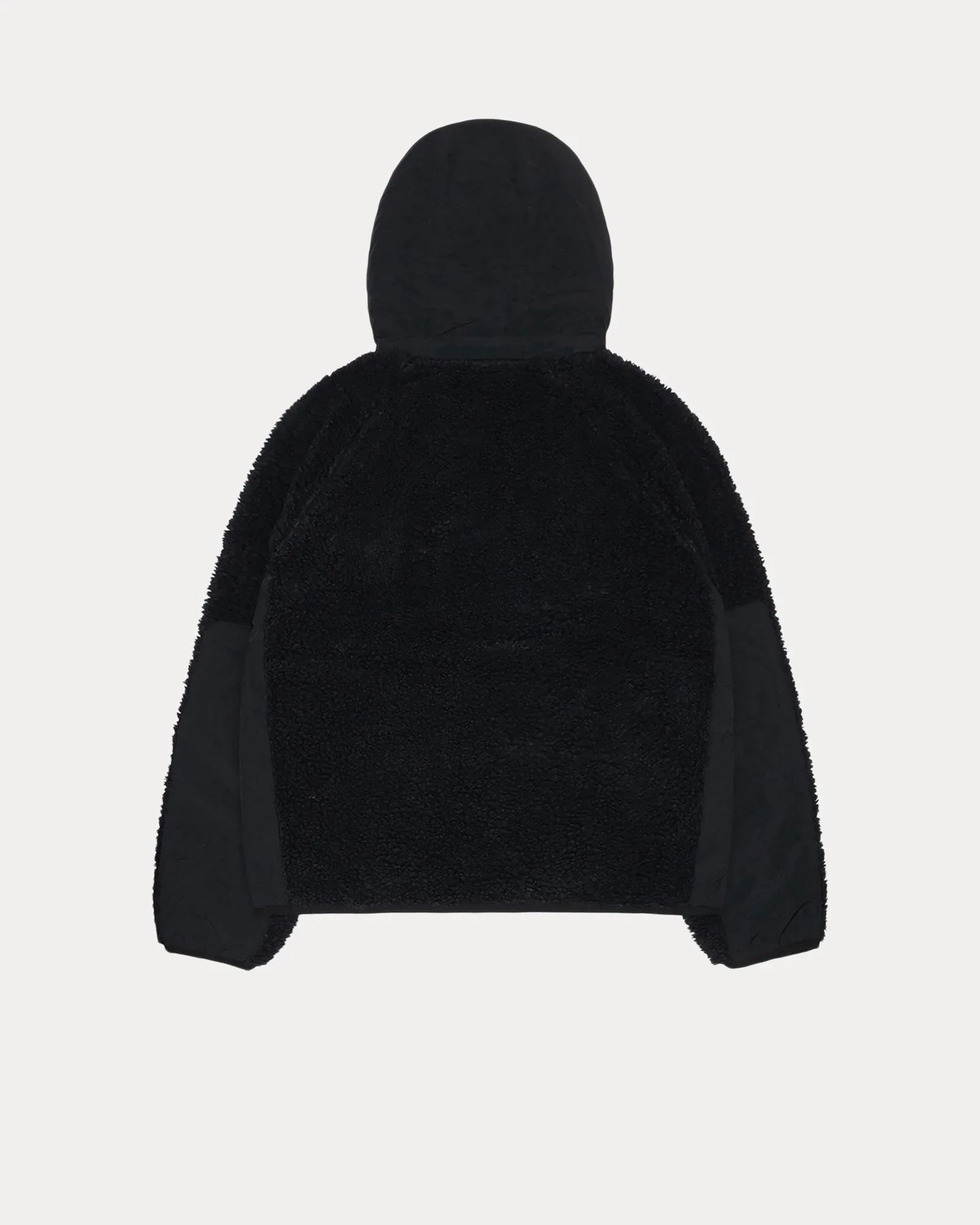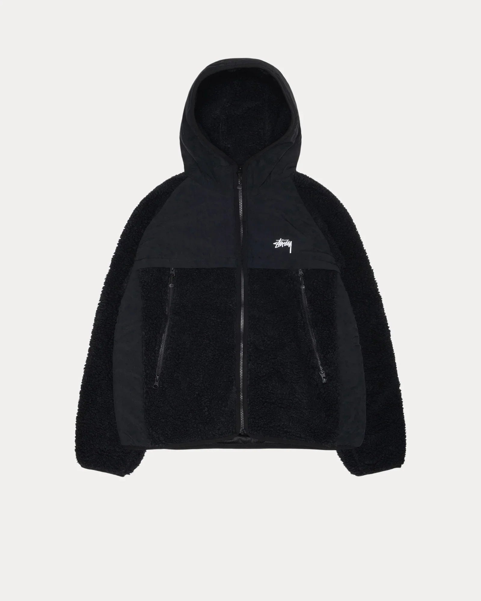 Relaxed hooded jacket with sherpa fleece and nylon panels. Features a front zip closure, angled pockets and raglan sleeve. Stüssy stock logo screenprinted at the chest.