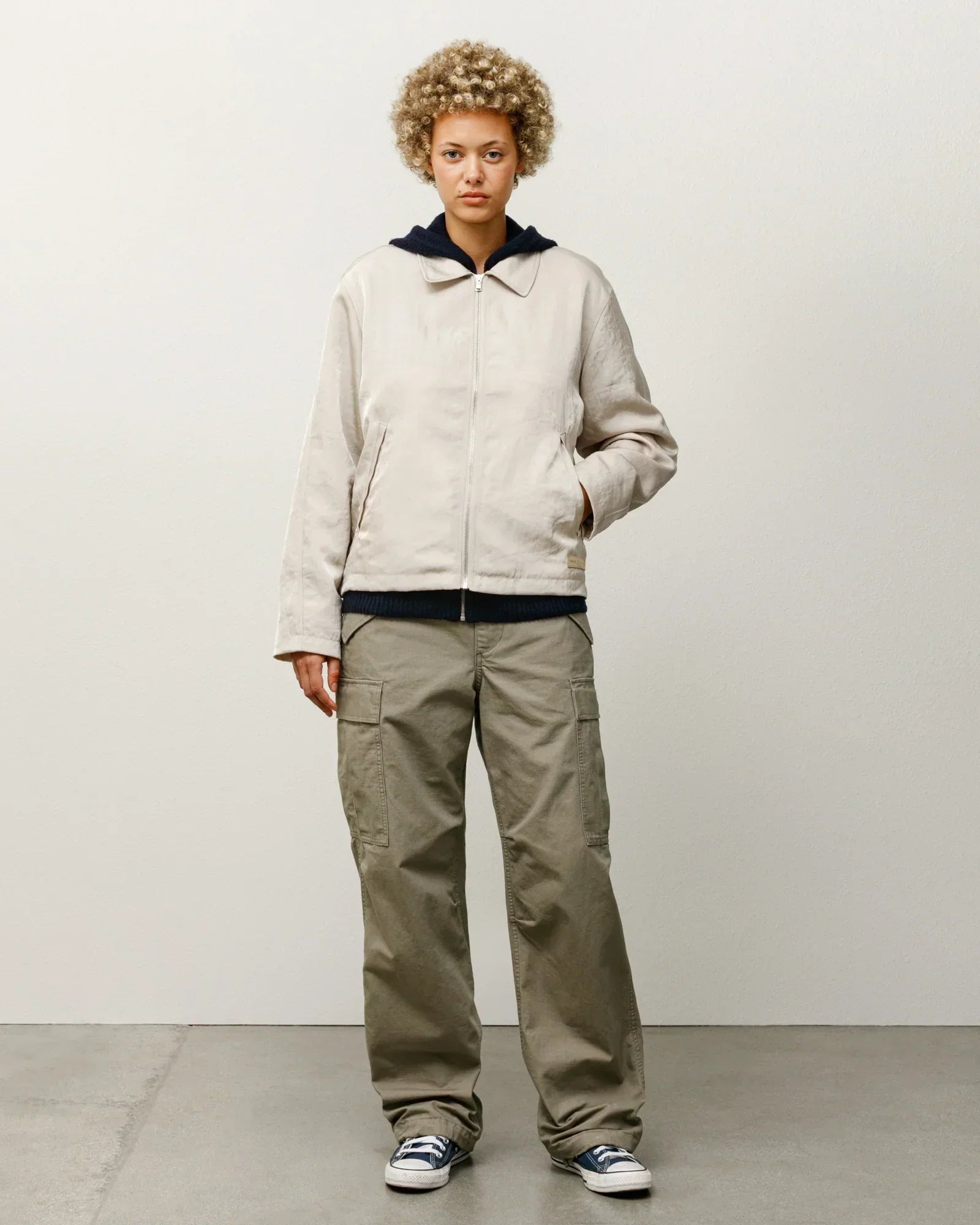 - Features a front zip closure, welt pockets and leather Stüssy logo patch